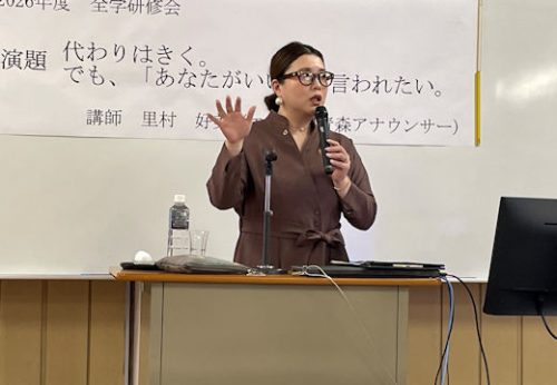 エフエム青森アナウンサーの里村好美様をお迎えし、『代わりはきく。でも、「あなたがいい」と言われたい。』という演題で、全学研修会を実施しました。